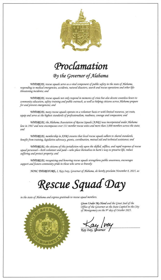 The 2025 Executive BOD for the Alabama Association of Rescue Squads, will assume their respective offices effective 1 Jan 2025.